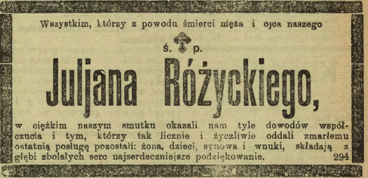 W 1859 roku Julian Różycki ożenił się z Franciszką Rygier, siostrą zamożnego rzeźbiarza, twórcą pomnika Mickiewicza na Krakowskim Rynku. Miał z nią czworo dzieci: Wacława, Władysława, Leona i Amelię.